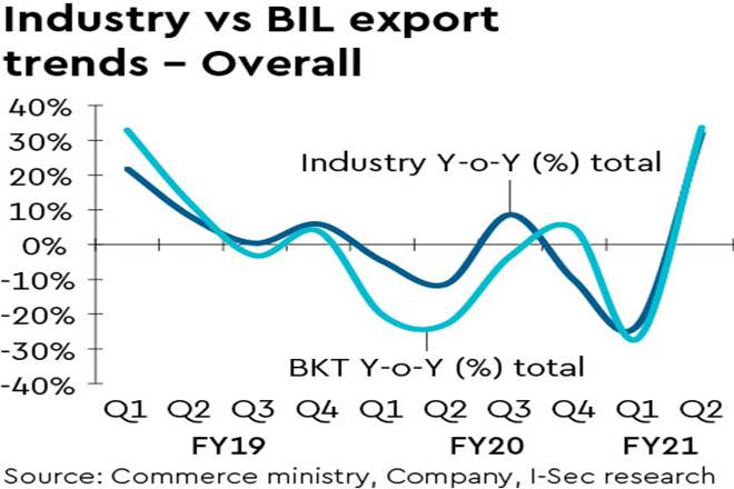 Agri exports recover, OTR hit by Covid: After the initial Covid shock (~23% decline) in Q1FY21, exports had shown signs of recovery, only to be hit by the second wave. This has led to the overall industry clocking ~10% decline YTD. We believe the outlook for global Ag exports remains strong under the rising commodity price environment. OTR demand is also likely to be supported by infrastructure/mining investments in FY22 and beyond as commodities outlook remains firm.