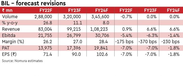 BIL’s Q3FY22 revenue at Rs 20. 8 bn, +39% y-o-y, was largely in line with our and consensus estimates. However, Ebitda at Rs 5.1 bn, +7% y-o-y, was ~7% below our/consensus estimates. Ebitda margin disappointed at 24.4% (Nomura: 27%, consensus: 26%) on rising commodity (RM/sales +186bps q-o-q) and higher marketing (+Rs 100 mn)/fuel expenses (other expense/ sales +108bp q-o-q). Q3 volumes were at ~70.3k tons, up 18% y-o-y (in line).
