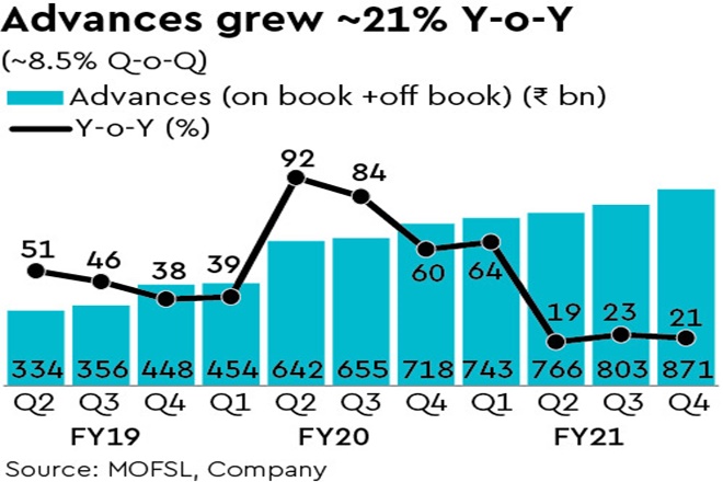 Bandhan Bank released its quarterly business update highlighting the trends for Q4FY21. Advances (on book + off book + TLTRO investments) grew by 21.2% y-o-y (8.5% q-o-q). This growth would have been enabled by both the MFI and HFC book as economic activity is recovering. BANDHAN continues to report strong (36.6% y-o-y/9.5% q-o-q) deposit growth of ~Rs 780 bn, led by robust (~61% y-o-y/~11% q-o-q) growth in CASA deposits. The CASA ratio improved by ~50bp q-o-q to 43.4%. The proportion of Retail deposits stood at 79% v/s 81% in Q3FY21 and 78% in FY20. The LCR ratio stood at ~122% as of FY21.