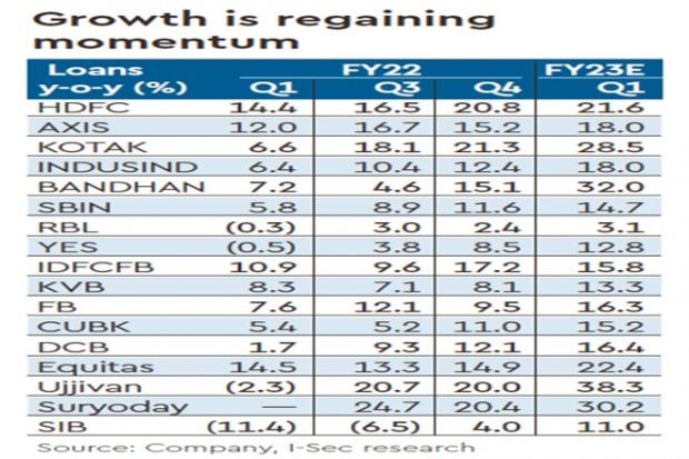 Advances growth at 2-4% q-o-q: Bank credit is likely to register >2% q-o-q />12% y-o-y growth. Financiers under coverage are likely to report 2-4% q-o-q growth. HDFC Bank, Kotak, IDFC FIRST Bank are estimated to outpace peers with >20% y-o-y credit growth. IndusInd, YES are likely to gain momentum on a lower base to 14-18% growth. RBL will continue to lag industry average growth.