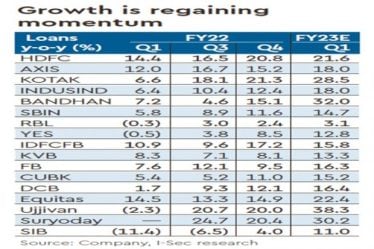 Q1FY23 is anticipated to reflect that asset quality woes have waned for financiers and the focus is shifting back to growth. Slippages and credit cost are likely to remain at least stable, if not improve and stressed pool will descend. Post repo rate hike, rise in retail deposit rates by banks lagged the lending (EBLR as well as MCLR) rate hike. We expect the impact on NIMs to be i) relatively more adverse for RBL, IDFC FIRST Bank, IndusInd, Kotak; and ii) favourable for SBI and Axis.