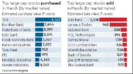 On the buy side, banks dominate the list of top 5 stocks bought in the month with only the first spot being acquiesced to Tata Consultancy Services (TCS), which saw net purchases worth Rs 4,162 crore. Bandhan Bank was the second-most-bought stock, followed by State Bank of India (Rs 1,280 crore), ICICI Bank (Rs 1,275 crore) and Kotak Mahindra Bank (Rs 1,067 crore).