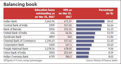 Public-sector banks (PSBs) ended FY17 with bad loan ratios in the education loans category as high as 18% in some cases, data released by the ministry of finance showed. Going by the data in the documents placed by the ministry in the Lok Sabha and numbers put out by PSBs in their annual reports and/or investor presentations, seven PSBs had a double-digit gross NPA ratio as a share of their education loan portfolio, as on March 31, 2017. At 18.43%, Chennai-based Indian Bank had the poorest NPA ratio among PSBs, followed by Central Bank of India (16.64%) and Bank of Baroda (16.13%). The average NPA ratio of 18 PSBs was 8.89% at the end of FY17. This figure does not account for the NPA ratios of State Bank of India (SBI) and its associates, IDBI Bank and UCO Bank. Their ratios could not be ascertained as the value of their education loan portfolios was not readily available. In absolute terms, SBI and associates saw NPAs worth Rs 891.94 crore in education loans, while the numbers for UCO Bank and IDBI Bank were Rs 346.71 crore and Rs 35.58 crore, respectively. Analysts have earlier flagged the worsening of asset quality in the education loans space. In August 2017, credit rating agency TransUnion CIBIL wrote that small-ticket education loans were seeing high levels of delinquency.