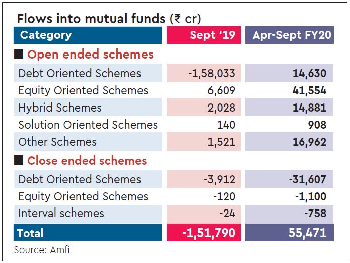 Equity funds saw inflows of just Rs 6,609 crore in September, the lowest in the last four months, while money moved out of debt schemes causing the mutual fund industry to report outflows of Rs 1.51 lakh crore.
