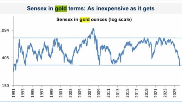 A little probe into the data offered by Morgan Stanley highlighted that when we track the Sensex movement and gold’s price action between 1991 and 2025, Sensex measured in gold ounces, is close to earlier troughs in the market.