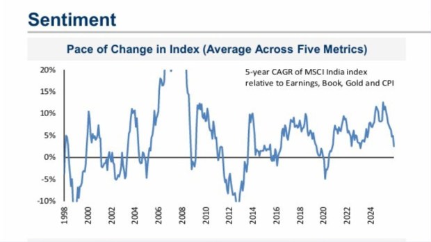 This immediately brings the focus on the relative performance of both these asset classes – equities and the safe haven buys like gold. Morgan Stanley tracks the 5-year compounded annual growth rate of the MSCI India Index and highlighted the trend between 1998 to 2025.