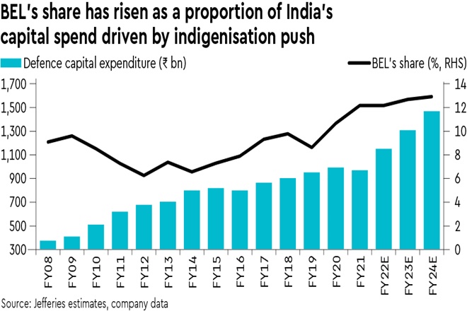 ‘Make in India’ government focus clear: Mgmt highlighted that 692 items have been uploaded on the Ministry of Defence indigenisation portal. EOIs for 69 items have also been published under Make-II. BEL is providing test facilities to private vendors apart from participating. Company saw 13% revenue CAGR vs single-digit Defence Capital budget CAGR since indigenisation effort began in FY15. Focus again on domestic manufacturing should see this higher CAGR sustain.