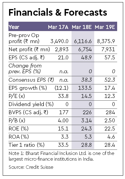 The company has not been adding any new borrowers since demonetisation (unlike elsewhere in the country). Fresh loans are disbursed only to fully current borrower groups. This seems to have helped reinforce better behaviour. Borrowers we spoke to were aware of the credit bureaus. We continue to see value in the BHAFIN stock, and retain our Outperform rating. While there could be 1-2 quarters of further high provisioning, this is well known to the markets. Looking beyond, we believe that the stock should re-rate as fresh slippages stay in check and growth/profitability improve.