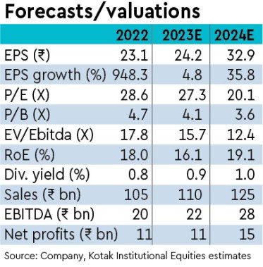 Strong order wins across segments to drive growth; however, margins to remain under pressure: We expect strong revenue growth over FY2023-24e led by (i) strong order wins across automotive and industrial applications (Rs 10 bn worth of new order wins), (ii) recovery in the domestic CV segment, (iii) market share gains in the domestic PV segment led by new product launches and (iv) expected order win for artillery guns in the defence segment. However, we believe margin pressures will remain given persistent inflationary pressure as well as elevated freight and energy costs.