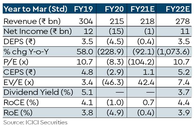 Given subdued execution, high raw material and fixed expense, we estimate a net loss of Rs 1.5 bn in FY21e and cut FY22e earnings by 10%. Given the macro challenges, weak balance sheet and uncertainty regarding strategic initiatives that can meaningfully substitute thermal power equipment, we downgrade the stock to Sell (from Reduce) with a revised TP of Rs 24 (previously: Rs 27).