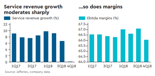 Muted results: Infratel reported muted quarter though slightly better than expectation. Revenues grew 4% y-o-y (JEFe 4%) and margins declined 117bps y-o-y (JEFe 200bps). The beat was led by energy revenues. Energy revenues grew +10% y-o-y while service revenues were flat. Energy Ebitda increased 18% y-o-y while service margins declined 30bps y-o-y.