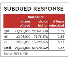The initial public offering (IPO) of Bharat Road Network, a Srei Infrastructure Finance company, was subscribed 1.77 times on Friday with investors bidding for 5.19 crore shares of the 2.93 crore shares on offer. The qualified institutional buyers bid 2.91 crore shares on the third day of the IPO. High net worth individuals (HNIs) bid for 71.78 lakh shares and retail investors bid for 1.56 crore shares of the 29.30 lakh shares on offer.