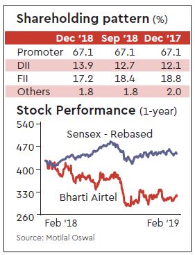 BHARTI’s board has approved Rs 320-bn fund raise via an Rs 250-bn rights issue and Rs 70 bn (foreign denominated) perpetual bonds with equity credit. The Rs 250-bn rights issue will be raised in the ratio of 19:67 at a price of Rs 220/share (which is a steep 30% discount to CMP). Since the rights issue is at a discount, the dilution in earnings should result in a correction of stock price from Rs 318 now to Rs 296 over the record date. FY19 net debt stands at Rs 1,148 bn, with net debt/Ebitda of ~4.5x. However, post the Rs 250-bn fund raise, FY19 net debt/Ebitda would come down to 3.5x with net debt of Rs 898 bn.