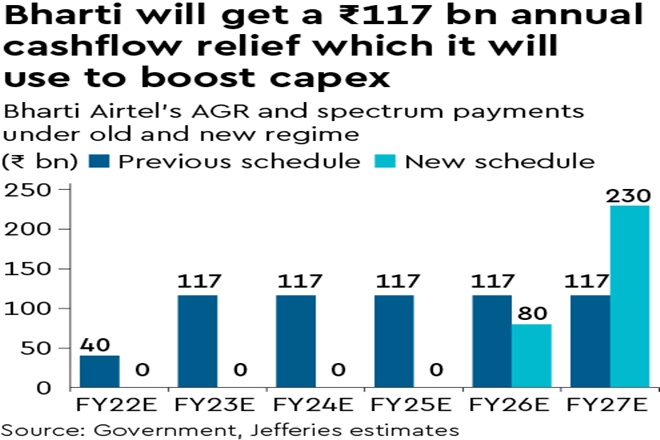 The government’s four-year moratorium on AGR/spectrum payments will offer VIL cashflow relief and could lead to government taking up a sizable stake in VIL. However, Bharti’s usage of its Rs 117-bn annual cashflow relief for capex will accelerate market share shifts in its favour. We expect Bharti to gain 340bps market share to 39% over FY22-24 driving 20% Cagr in India mobile Ebitda. We raise our PT to Rs 850 on higher multiples to factor in potential growth acceleration. BUY