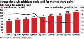 Bharti Airtel’s Q4FY20 results surprised positively with India mobile ARPUs rising by a sharp 14% q-o-q and strong 10 m data subscriber additions despite sharp tariff hikes. Bharti’s ability to attract data subscribers should support market share gains. We raise our FY21-23 forecasts by 3-6% and reiterate Buy with revised target price of Rs 660/share.