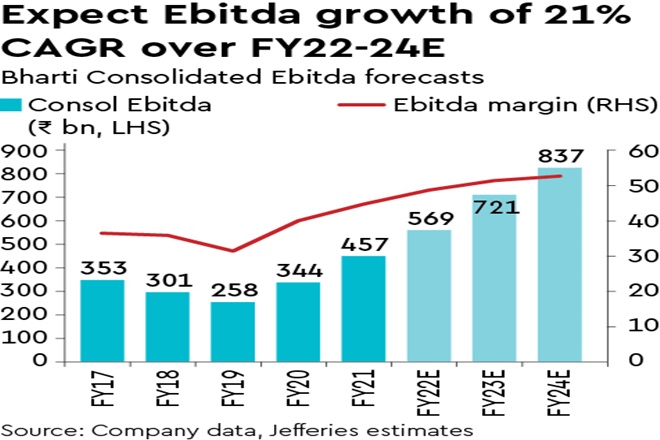 Raise estimates/PT: We raise our India mobile revenue/Ebitda forecast by 8-15% on higher ARPU estimates. Over FY22-24, we expect Bharti to deliver 17%/21% CAGR in consol. revenue/ Ebitda, assuming no further tariff hikes till Q4FY24. Despite our projection of $11-bn capex including $2 bn for 5G spectrum, we expect Bharti to deliver $5.3 bn of cumulative FCF over FY23-24. We raise our PT to Rs 925 which implies a consolidated EV/Ebitda of 8.8x, largely in line with Bharti’s 3-yr average of 8.6x. Maintain Buy.