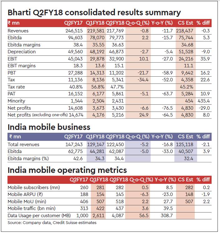 Bharti reported a 5/8% beat on Ebitda/adjusted net profits, respectively, for the Sep-17 quarter. 60% of Ebitda beat came from Africa (17% higher than estimates), while India mobile Ebitda was 4% ahead. Being able to maintain margins in India mobile in a seasonally weak quarter with 5% revenue decline is commendable. We would look to understand the sustainability of these cost-cutting measures on the call. The trends in Africa are puzzling with company appearing to completely cut down on capex, network sites being shut down and employee count falling. While these are helping shore up profitability, we are surprised at the extent of ‘inefficiencies’ being found (seven years after buying Africa from Zain). Our EPS numbers go up 5-6% as we factor in better Africa margins. Along with roll forward, our TP goes up to Rs 430 (from Rs 400). We retain Neutral rating on the stock.