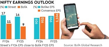 The Street’s optimistic earnings growth estimates for FY24 and FY25, of 17% and 16% respectively, for the Nifty set of companies could be cut by 40%, Bank of America (BofA) Securities said on Thursday citing, among other factors, a recession in the US. The brokerage noted there were already signs of earnings weakening in the wake of the global slowdown.