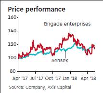 BEL has pre-leased 500k sf across its ongoing lease portfolio, and expects to complete pre-leasing at Brigade Tech Gardens in FY19, which is comforting. It maintains a positive outlook on office segment (low vacancy currently) and remains committed to expanding the annuity income portfolio from ~Rs 5 billion to Rs 16-17 billion over the next 4-5 years.