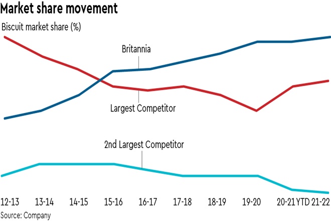 Britannia is the value leader in the biscuit category and has sustained market share gains. We believe its growth will continue to outstrip the industry well. Its deepening distribution network, particularly in rural, with focus on driving growth in weak states – Gujarat, Madhya Pradesh, Uttar Pradesh and Rajasthan – will hold it in good stead. The company’s aggregate growth has improved with the rise in its market share.