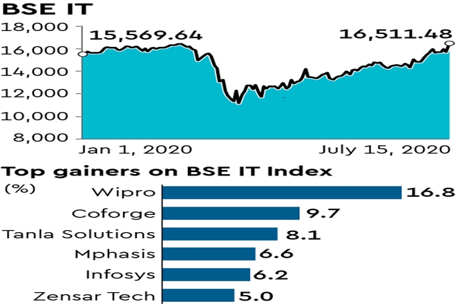 While the BSE IT Index surged 5% or 770.14 points to close at a record-high of 16,511.48 points on Wednesday, the Sensex ended flat at 36,051.81 points, up 0.05%.Shares of the second-largest IT firm, Infosys, soared to a 52-week high on Wednesday before announcing its quarterly numbers. Later the day, the company reported better-than expected earnings for the quarter ended June. The Infosys stock has added 13.6% so far in 2020 against the Sensex fall of 12.6%. While the shares of Tata Consultancy Services (TCS) gained 2.9%, HCL Technologies and Tech Mahindra gained 4.1% and 2.8% respectively.