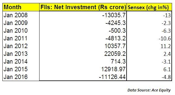 The net outflows by FIIs in January 2016 stood at Rs 11,126.40 crore, which is the worst in the past eight years in the first month. Foreign Institutional Investors sold shares worth Rs 13,035.70 crore in January 2008.