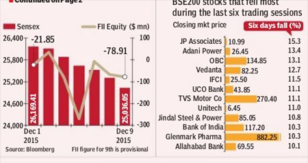 The Sensex continued on its losing streak for the sixth straight session on Wednesday, giving up a total of 1,133 points or 4.33% over the period, reports fe Bureau in Mumbai. Since last Wednesday, over a third of stocks in the BSE 200 have lost over 6% of their value while 13 have dropped by over 10%. Foreign investors have liquidated close to $470 million worth of Indian shares in this time.