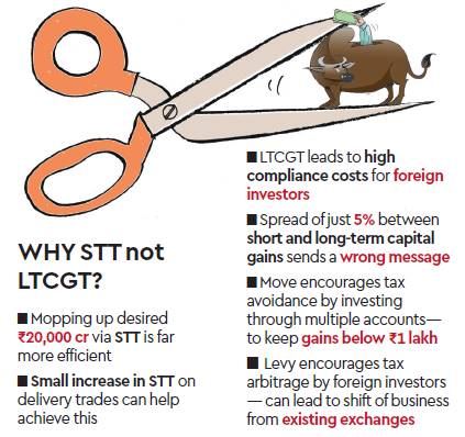 A fund manager said, “The reintroduction of LTCGT has not gone down very well with the investor fraternity. Increase in STT would have been understood by the markets. With this, a lot of compliance comes in for many foreign portfolio investors.” Nirmal Jain, founder, IIFL, was more forthright: “We should not forget that when STT was introduced, it was in place of lower taxes on capital gains. That is the problem with our Indian tax system. Instead of making it simpler, we make it complicated.” The head of a leading securities firm contended, “There would have been objections if they had increased STT too, as people would have talked about higher transaction cost hampering liquidity. It would have hurt the derivative traders because derivatives work on a thin margin.” A rough math shows that without disturbing the derivatives market, just by increasing the levy on delivery based trades—which are also the ones eligible for LTCGT—the government can easily mop up its desired sum, which brokerage Motilal Oswal estimates at about Rs 20,000 crore.