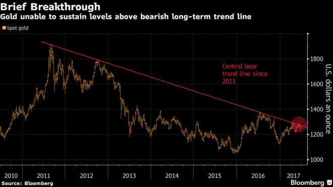 In early June, prices burst through a slumping trend line going back to the record $1,921.17 in 2011. But the rally failed to hold above the long-term bearish trend, and that “is not a healthy sign,” said Fawad Razaqzada, a London-based analyst at brokerage Forex.com. Prices could drop to $1,236, and then to $1,200, he said, adding a decisive break above the line is needed to signal the end of the downtrend.
