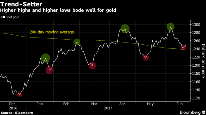 There are also some bullish signs. Higher highs and higher lows signal a continuing rally for some technical analysts. Prices will stabilize between the 200-day moving average at $1,237 and $1,250 and then edge higher toward $1,300 later in the year, as the U.S. dollar comes under more downward pressure, according to Georgette Boele, a currency strategist at ABN Amro Bank NV in Amsterdam, on Wednesday.