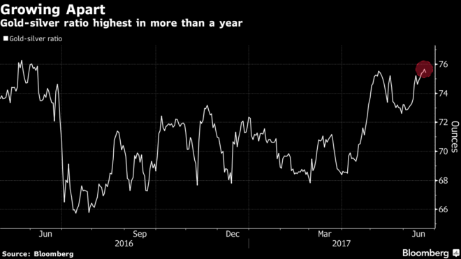 Gold is the most expensive relative to silver in more than a year. The metal is little changed in the second quarter while silver has lost 9 percent. Silver tends to fall more than gold when precious metals weaken, while the reverse happens in a bull market. The ratio of 75 is above the 10-year average of 62.5.