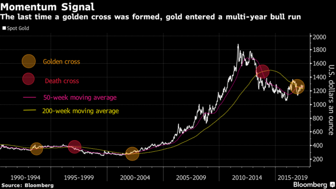 Gold may be in a longer-term bullish trend signaled by the formation of a rare golden cross in December, according to Ned Naylor-Leyland, manager of the Old Mutual Gold & Silver Fund. That’s when the 50-week average moved above the 200-week gauge, and the previous time it happened was in 2002. After that, gold climbed more than sixfold in nine years. Every time they’ve crossed in the past 30 years, it foreshadowed a broad price move that lasted at least three years in gold and real bond yields, according to Naylor-Leyland.