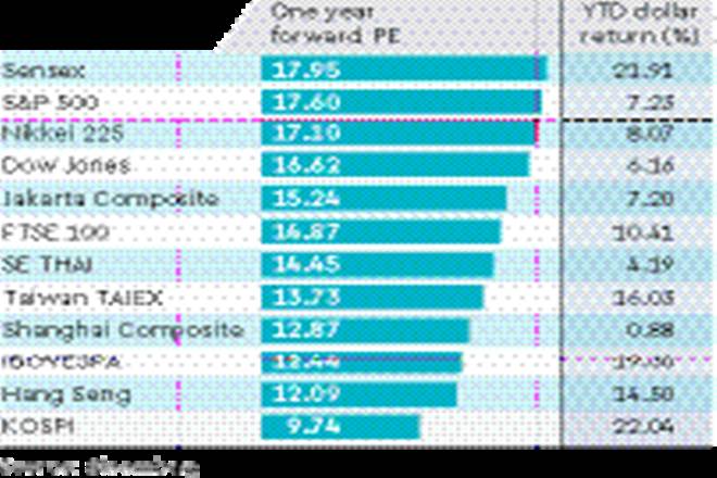 The S&P 500, which closed Tuesday’s session at 2,400.67, is a shade less expensive than India, trading at 17.60 times, while the Japanese Nikkei, at 19,814.88, trades at 17.1 times. Both foreign portfolio investors and domestic institutions have been big buyers of Indian equities in 2017; between January and now, FPIs have pumped in close to $6.8 billion into equities while domestic funds have bought stocks worth $1.82 billion.