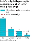 Polyolefin demand in India stands at 13.05mmtpa, which is likely to grow at 11-12% annually (1.5x GDP). India imports around one-third (4.2mmtpa) of total demand for polyolefin. Besides, per capita consumption of polymers in India stands at just 10kg v/s global average of 32kg. Despite the huge domestic production gap, only HMEL’s (HPCL-Mittal Energy’s) Bhatinda Petrochemical Project is expected to come online by 2022-23.