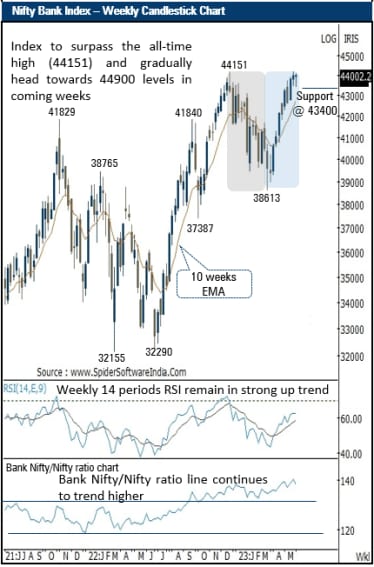 On relative terms, Bank Nifty continues to outperform the Nifty. The Bank Nifty/Nifty ratio line continues to trend higher and maintain higher high-low signalling extended period of outperformance. The index has immediate support at 43,400 levels being the confluence of the last two weeks identical lows and the 50% retracement of the recent up move (42,582-44,151). Among the oscillators, the weekly 14 periods RSI remain in uptrend thus supports the overall positive bias in the index.