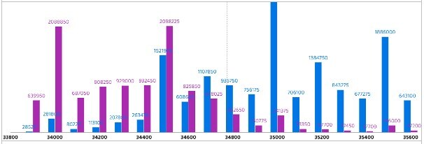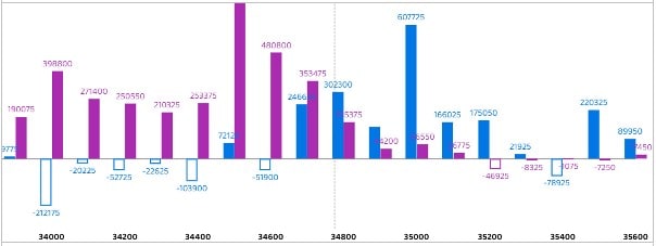 Bank Nifty Put options OI distribution shows that 34,000 has highest OI concentration followed by 34,500 & 33,500 which may act as support for current expiry and on the Call front 35,000 followed by 36,000 & 35,500 witnessed significant OI concentration and may act as resistance.