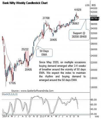 – Key observation is that the index since April 2020 has not corrected for more than four weeks barring one instance while 50 days EMA has acted as strong support during each of the corrective phase. In the current scenario with three weeks of decline already behind us, we expect the index to maintain the rhythm and form a higher base around 50 days EMA (currently placed around 38390)