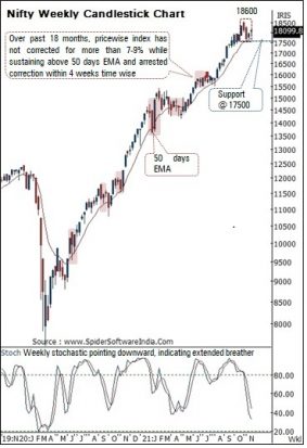 – Structurally, the higher base formation above 50 days EMA signifies robust price structure that makes us believe that ongoing breather would find its feet around 17500-17600 range as it is confluence of: