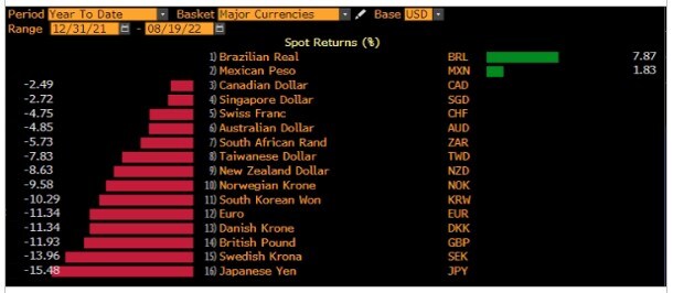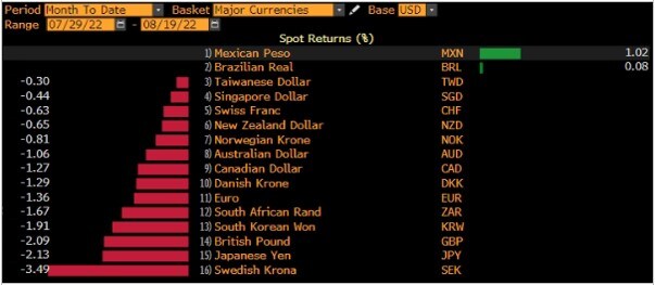 RBI’s paper on “Exchange Rate Volatility in Emerging Market Economies” clearly showcases how the rupee has been able to handle the recent advance by the DXY Index vis-à-vis many other emerging currencies. The rupee remained the median performer among the Asian and Major currencies for the current month and year to date.