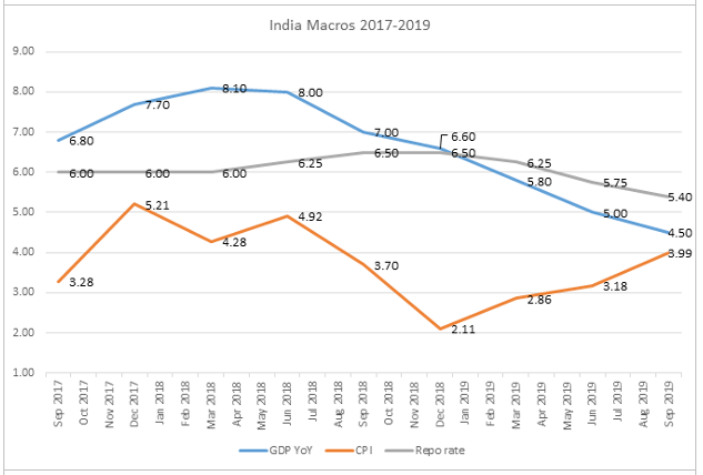 When we look at the last 2 years macro indicators of GDP growth and CPI inflation as also the RBI’s repo rate we observe that growth from a peak of 8.1% in Q4 FY18 has dropped to a low of 4.5% in Q2 FY20 which is also a 26 quarter low, whereas CPI inflation from a level of 2.11% in Q3 FY19 has gone up to 4% in Q3 FY20. The nominal GDP has come in at 6.1% for Q2 FY20 and just about 7% for the first half. The RBI’s FY20 GDP estimate for FY20 will be revised downwards as we observe some economists on the street have lowered their GDP estimates to sub 5% for FY20. The recent data on imports and exports also demonstrates a slowdown in the domestic and global economy. Since January of 2019, the Reserve Bank of India has cut repo rates by 135bps to account for easing inflation in the early part to growth concerns in the second half.