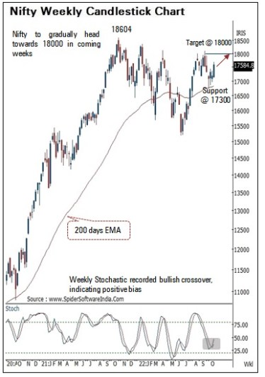 - The Nifty started the week on a positive note and endured its northbound journey as index witnessed positive close on all five sessions that helped index to resolve out of three weeks consolidation (17500-16700). The weekly price action formed a sizable bull candle carrying higher-high-low, indicating continuance of positive bias.