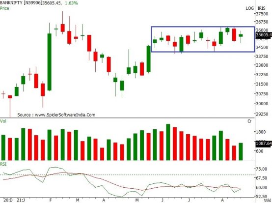 On the weekly chart the index has formed a small Bullish candle with shadows on either side indicating indecisiveness amongst participants regarding the direction. For the past three months, the index is consolidating within 36300-34000 levels indicating short term sideways trend. Hence any either side breakout will indicate further direction. The chart pattern suggests that if Bank Nifty crosses and sustains above 35800 level it would witness buying which would lead the index towards 36000-36500 levels. However, if index breaks below 35000 level it would witness selling which would take the index towards 34500-34000 levels.