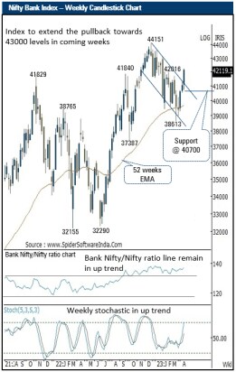 - The Bank Nifty gained for the third consecutive week amid firm global cues and closed higher by 2.6% at 42132 levels. Decline in CPI inflation for March further boosted sentiment. The weekly price action formed a strong bull candle with a higher high-low signalling continuation of the up move.