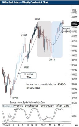 - Going ahead, we expect index to prolong consolidation in the band of 43400-44500 for few sessions. A decisive move from this range would set further directional bias.