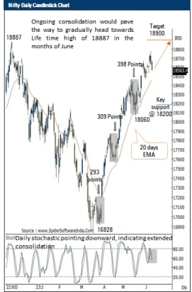 - Going ahead, we reiterate our stance of Nifty gradually heading towards its lifetime highs in June 2023. In the process, buy on dips strategy would remain in focus which has been fared well since March as Nifty has not corrected for more than 400 points while sustaining above its 20 days EMA, placed at 18450.