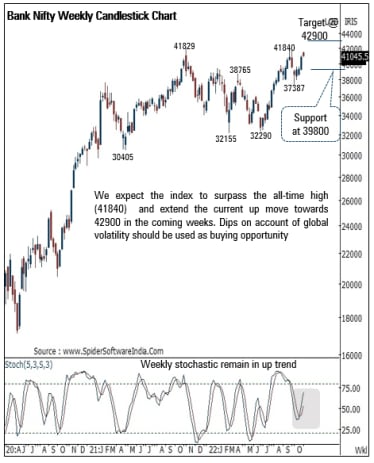 Amongst momentum oscillators, weekly stochastics remain in uptrend and has recently generated a buy signal thus supports the positive bias in the index. The Bank Nifty has support at 39800 mark being the confluence of the (a) 38.2% retracement of the last four weeks up move (37387-41530) placed at 39850 (b) the 20 days EMA currently placed at 40030 levels.