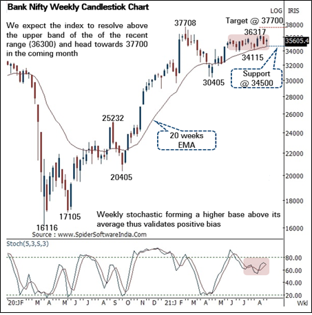 – Going ahead, we expect the index after the recent healthy base formation to breakout above the upper band of the range (36300) and head towards 37700 levels in the coming month as it is the confluence of the measuring implication of the recent range (36300-34800) and the previous all-time high of February 2021