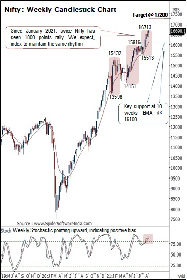 – Going ahead, we reiterate our consecutive stance as we expect the index to resolve above past two weeks’ consolidation (16700-16400) and gradually head towards our revised target of 17000-17200 in the coming month aided by firm global cues. Thereby any volatility from here on would present an incremental buying opportunity to own quality large and midcap stocks. Our target of 17000-17200 is based on following observations: