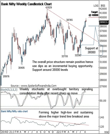 This expiry week, we expect the index to consolidate in the broad range of 38000-40000 after a strong rally of 14 % in just five weeks which has led to overbought condition in the weekly stochastic oscillator (currently placed at a reading of 93). We expect buying demand to emerge around the support area of 38000 hence use dips as an incremental buying opportunity.