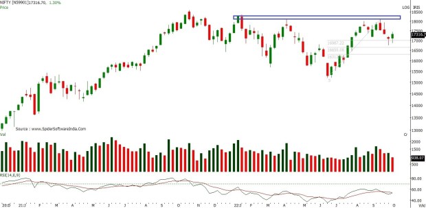 Nifty started the week on a flat note and traded with extreme volatility on either side for most part of the week, however buying momentum pulled the index higher to close in green. Nifty closed at 17315 with a gain of 220 points on a weekly basis. On the weekly chart the index has formed a small bullish candle with shadows on either side indicating indecisiveness amongst participants regarding the direction.